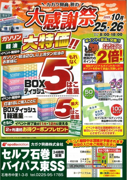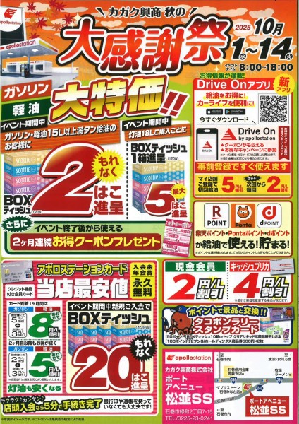 ガソリン・軽油、スタッドレスタイヤの大特価やキーパーコーティングの期間限定価格、お買い上げ記念品進呈など盛りだくさんで、皆様方のご来場をスタッフ一同、心よりお待ち申し上げております。